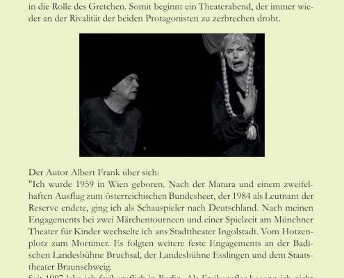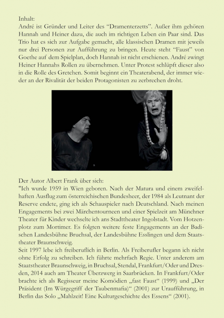 André ist Gründer und Leiter des “Dramenterzetts”. Außer ihm gehören Hannah und Heiner dazu, die auch im richtigen Leben ein Paar sind. Das Trio hat es sich zur Aufgabe gemacht, alle klassischen Dramen mit jeweils nur drei Personen zur Aufführung zu bringen. Heute steht “Faust” von Goethe auf dem Spielplan, doch Hannah ist nicht erschienen. André zwingt Heiner Hannahs Rollen zu übernehmen. Unter Protest schlüpft dieser also in die Rolle des Gretchen. Somit beginnt ein Theaterabend, der immer wieder an der Rivalität der beiden Protagonisten zu zerbrechen droht.