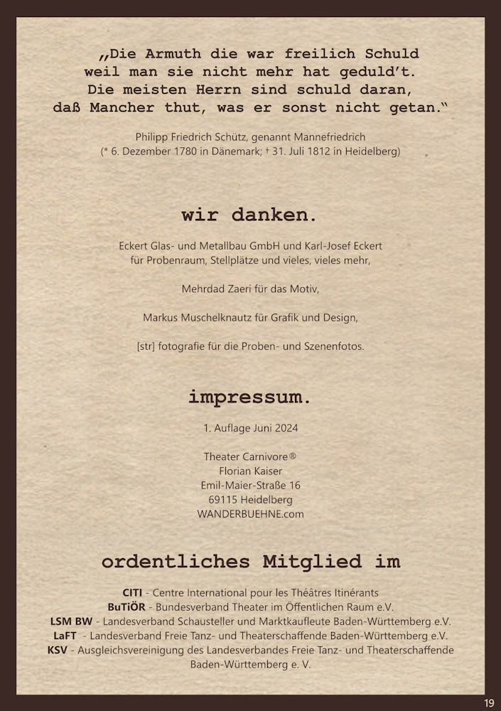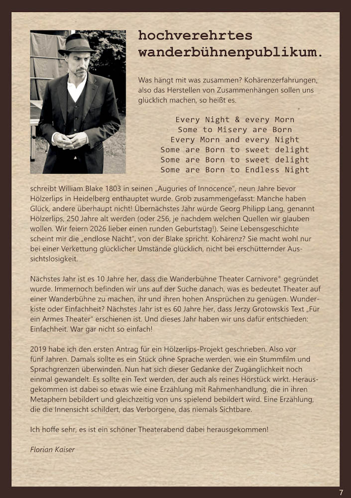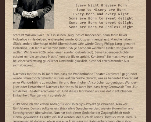 „Herzlichen Dank und großes Lob für diesen beeindruckenden Abend. Nur durch eure hohe Schauspielkunst ist es möglich die dramatischen Ereignisse vom Leben des Hölzerlips (Markus Schultz) auf eure Bühne zu bringen. Absolut gepasst hat in Heidelberg gerade auch die Vollmond-Nacht. Eine gute Idee und wunderbar zum Abschluss – mit den Schauspielern und für die Gäste das „Abendmahl“ mit kleinem Umtrunk und persönlichen Gesprächen. Ich komme gerne wieder.“