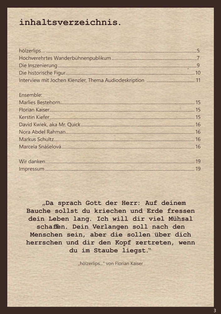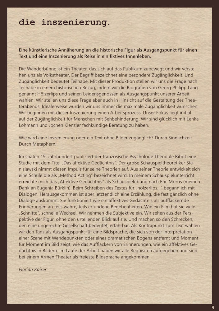 „Ich habe Hölzerlips in Heidelberg gesehen und war beeindruckt von der schauspielerischen Leistung des Ensembles (Hauptrolle Markus Schultz), sehr zu empfehlen. Es ist die dramatische Darstellung eines Menschen, der aus Armut in schlimme Situationen kommt. Die Geschichte beruht auf wahren Begebenheiten. Spannend bis zum Schluss.“