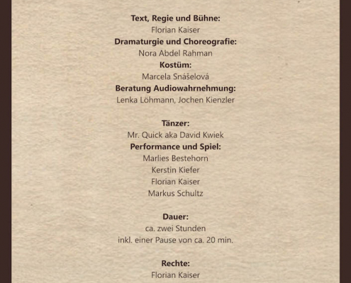 „… Die Schauspieler deklamieren keine Rollen, sie sprechen einen dramatischen Text in integrativer Audiodeskription. Das macht den Abend zu einem Hörspiel in Bewegung. Augen zu, Ohren auf? Der Selbstversuch zeigt, die Inszenierung wäre auch als Text ohne Bilder zugänglich…“