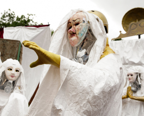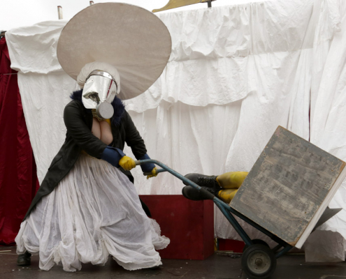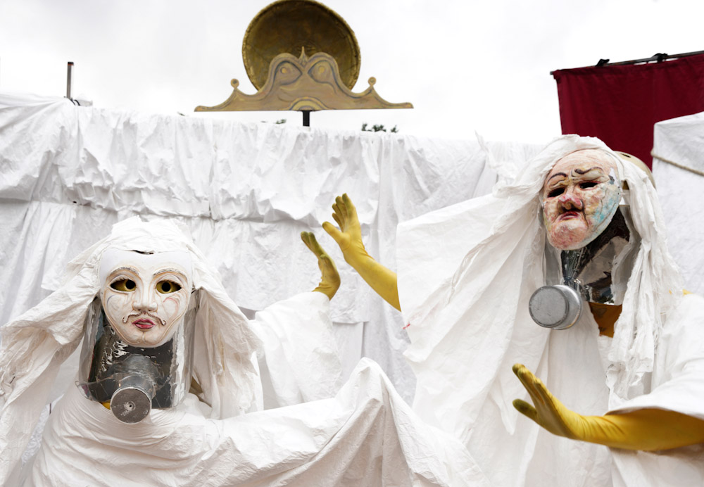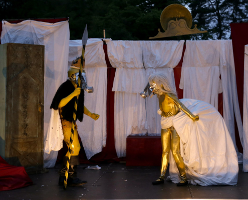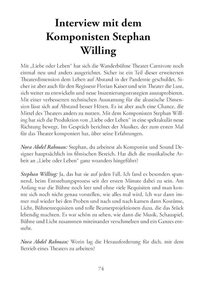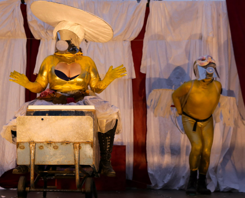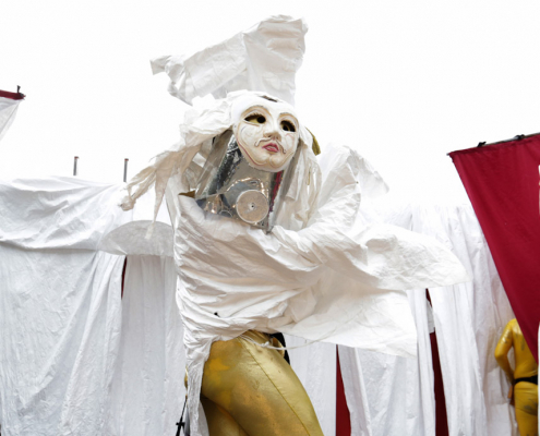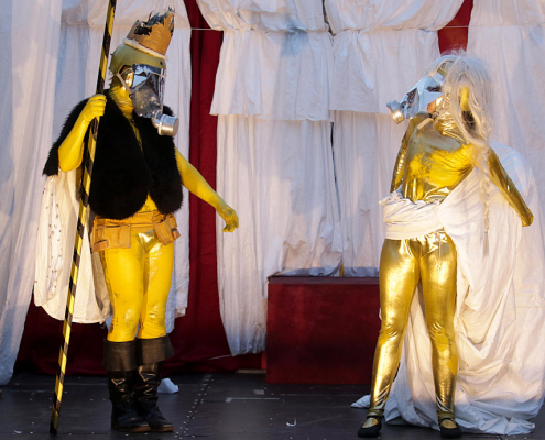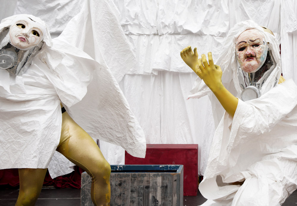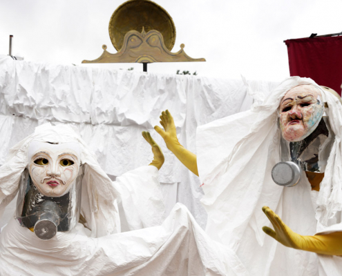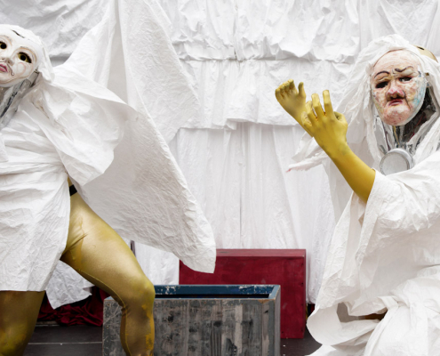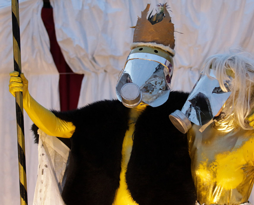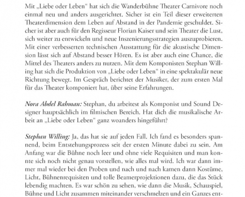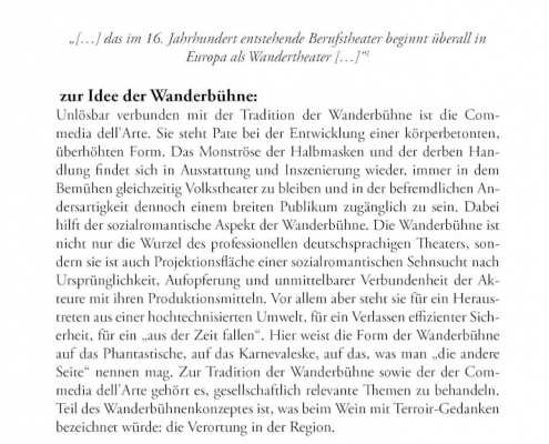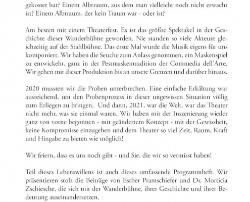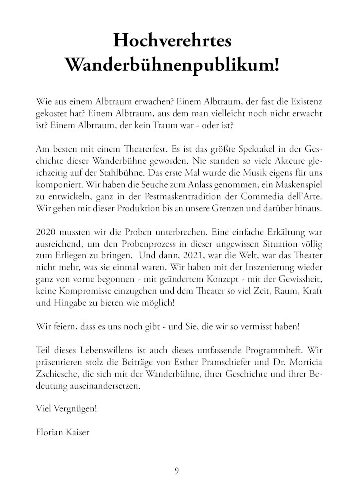 „…Florian Kaiser hat das Bühnengeschehen mit der aktuellen Pandemie verbunden und zugleich mit der Maskierung seiner Protagonisten die Pestmaskentradition der Commedia dell’Arte, gewissermaßen die DNA der Wanderbühne, aufgenommen…“