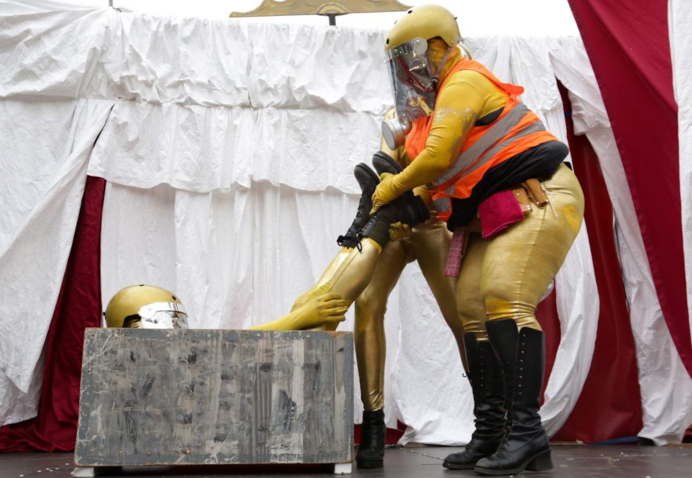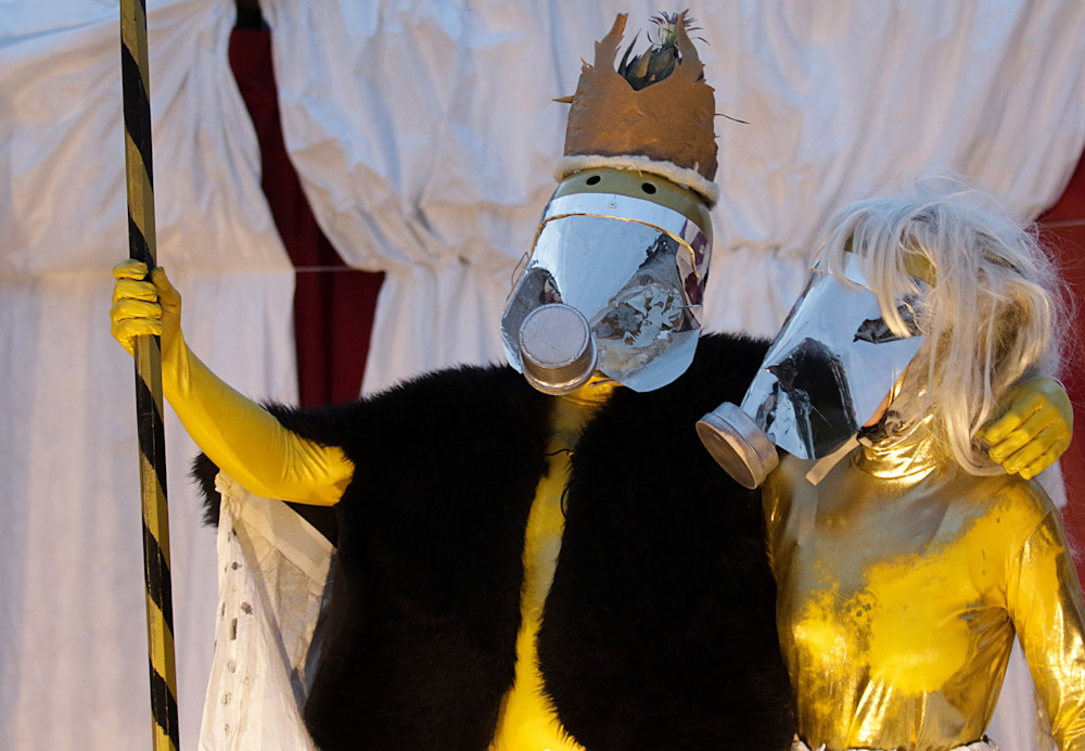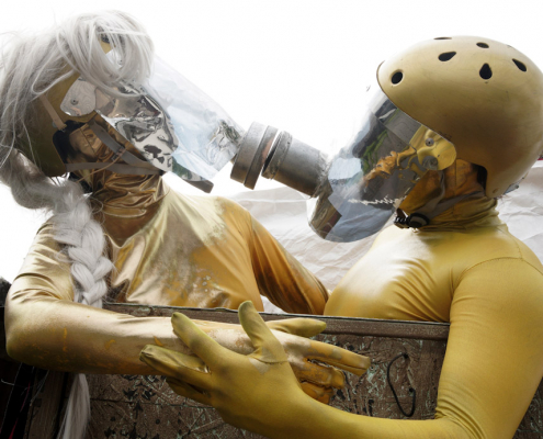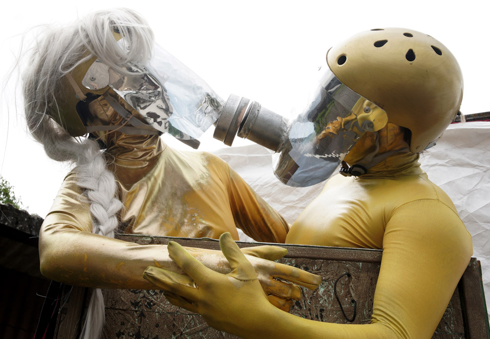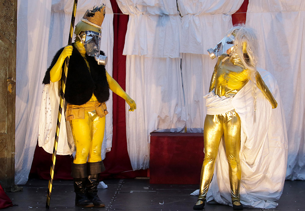 „…Wer auf Komödie gespannt war, wähnte sich in der nonverbalen Anfangsszene allerdings im falschen Film: Vier Gestalten in knallengen gelben Schutzanzügen mit schauerlichen Gasmasken bewegen sich zu dramatischer Musik (hier wie auch im ganzen Stück gelungen komponiert von Stephan Willing) in apokalyptisch anmutender Atmosphäre…“