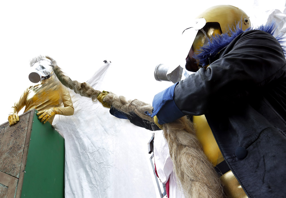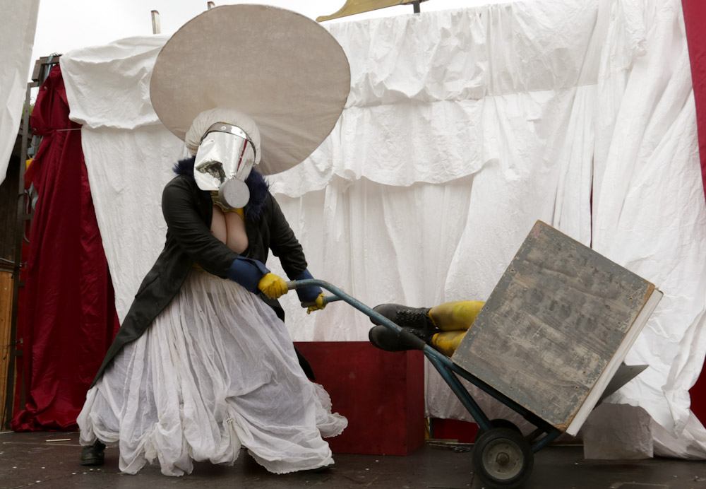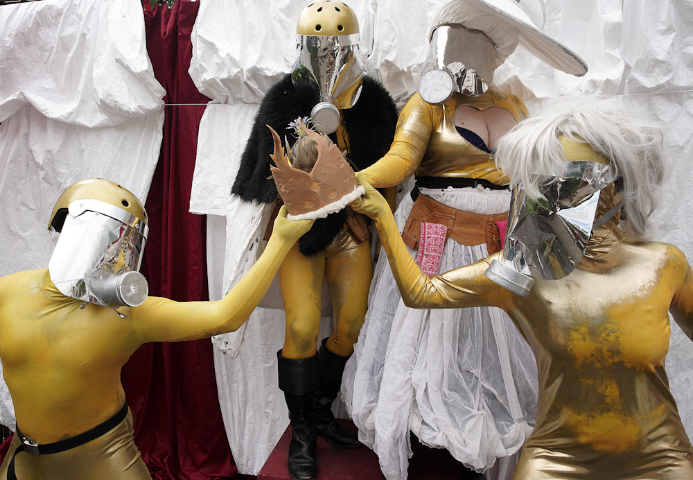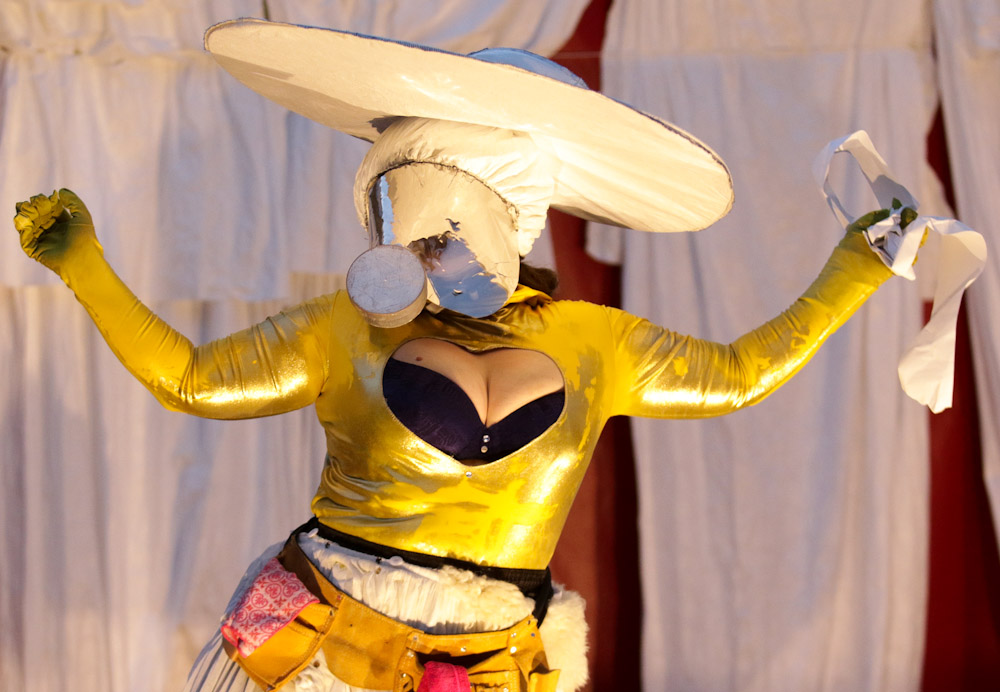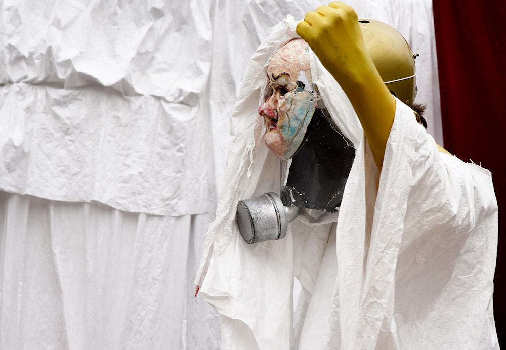 „…Wer auf Komödie gespannt war, wähnte sich in der nonverbalen Anfangsszene allerdings im falschen Film: Vier Gestalten in knallengen gelben Schutzanzügen mit schauerlichen Gasmasken bewegen sich zu dramatischer Musik (hier wie auch im ganzen Stück gelungen komponiert von Stephan Willing) in apokalyptisch anmutender Atmosphäre…“