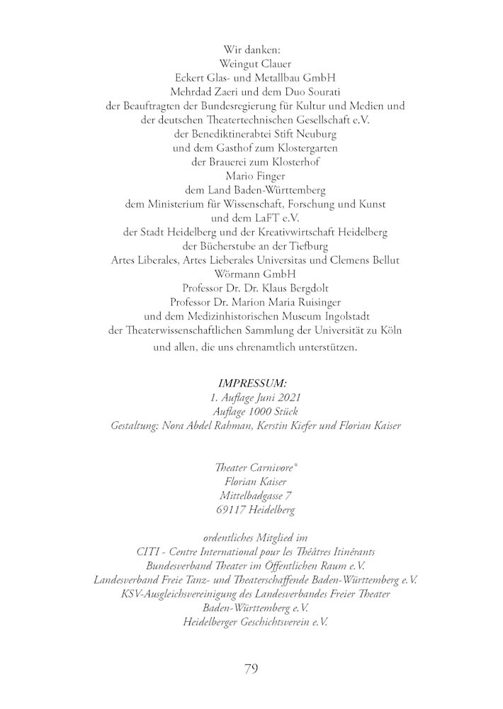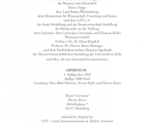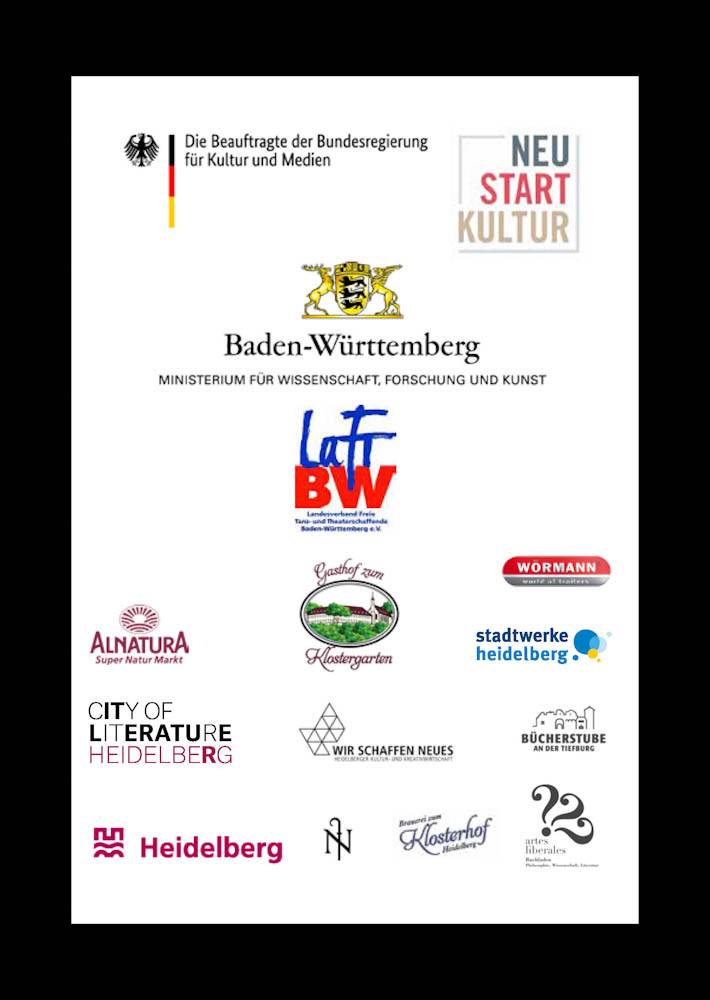 Gefördert von: Land Baden-Württemberg, LaFT BW, Stadt Heidelberg, Stadtwerke Heidelberg // Theater Carnivore® hat eine Förderung im Rahmen des Programms Neustart Kultur erhalten. Wir danken der Staatsministerin für Kultur und Medien und der Deutschen Theatertechnischen Gesellschaft, dem Ministerium für Wissenschaft, Forschung und Kunst Baden-Württemberg und der Stadt Heidelberg.
